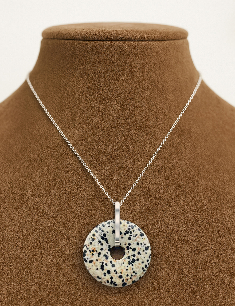 Colgante de Jaspe Dálmata natural en forma de dónut. Colgante elaborado en nuestro Taller de Minerales