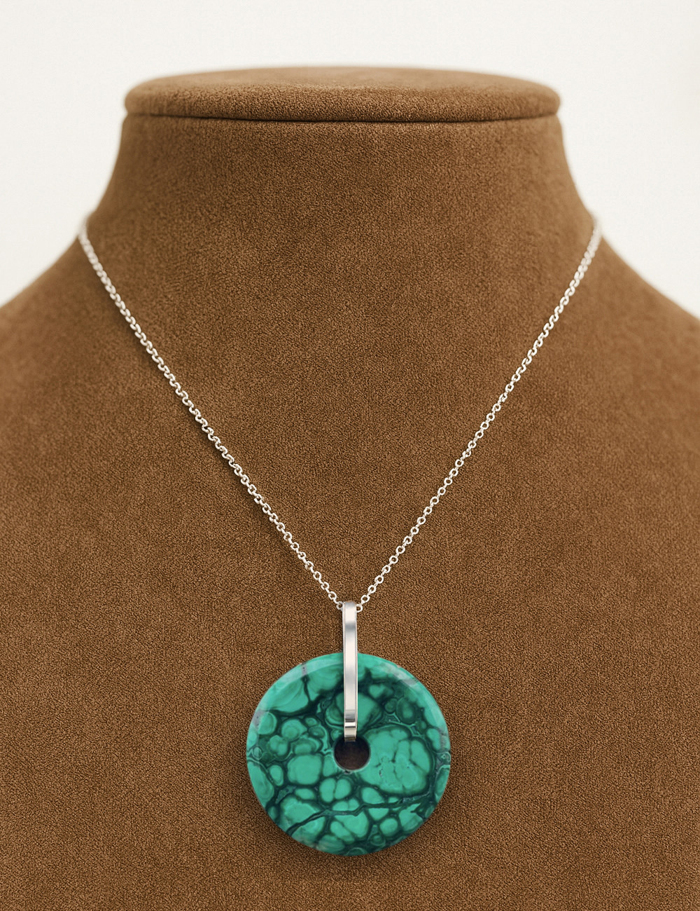Colgante de Malaquita natural en forma de dónut. Colgante elaborado en nuestro Taller de Minerales