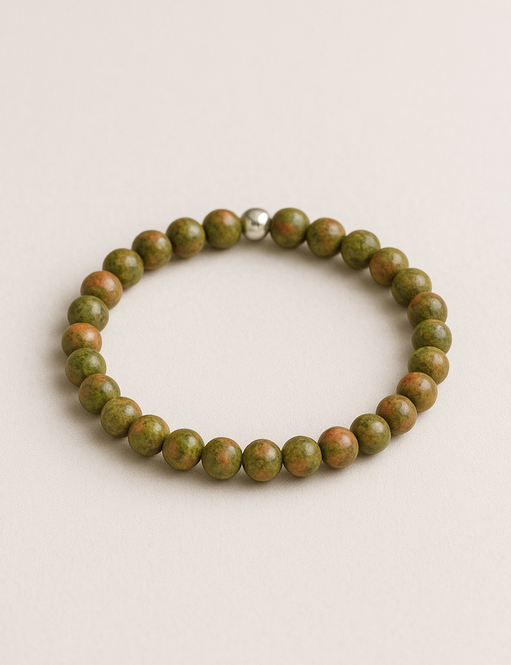 Debido a la naturaleza de los minerales, cada pulsera de Unakita  es única. Las variaciones en el color, las vetas y los patrones son características naturales que hacen que cada pieza sea especial y diferente. La pulsera de Unakita  que recibirás tendrá su propio y exclusivo diseño natural.