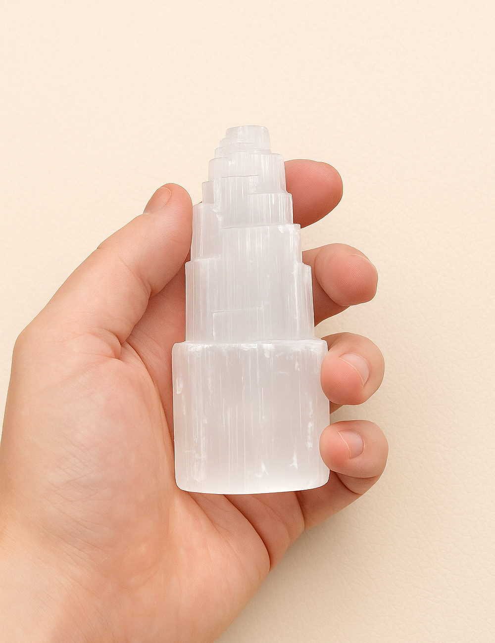 El nombre de Selenita nombre proviene de Selene, la diosa griega de la Luna. La Selenita Favorece la paz interior y claridad mental. Se asocia a la purificación de energía y la protección del aura. Promueve la calma, la serenidad y el equilibrio emocional. Facilita la conexión espiritual y la meditación.